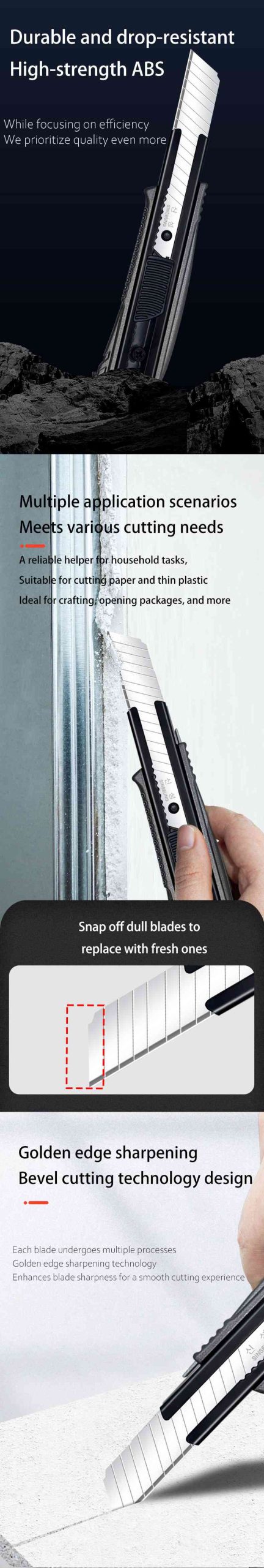 This 18mm cutter blade excels in diverse applications. As a paper knife blade, it ensures clean cuts on documents and packaging. As carpet cutting blades, it smoothly handles tough fibers and backing. Made from hardened high-carbon steel, this versatile cutter blade 18mm maintains sharpness for office and installation tasks.